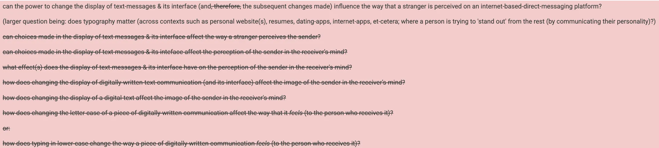 lastly, if i understand correctly, the objective of this assignment is not to produce new knowledge. why, then, must i uncover something that has not been documented before? when i conduct the same experiment, all the variables change — i am interacting with my friends, in another environment, et-cetera. so, the values will also change. the design of my experiment will also be different than others — because i am not looking for scientific validity. so, even though — say — brands have ‘understood’ that writing in lowercase feels more friendly (or whatever), the experiment was more around my communication with friends — how does the image of me change if i write with a different case? isn’t that a valid experiment? because we weren’t going for scientific accuracy anyway.