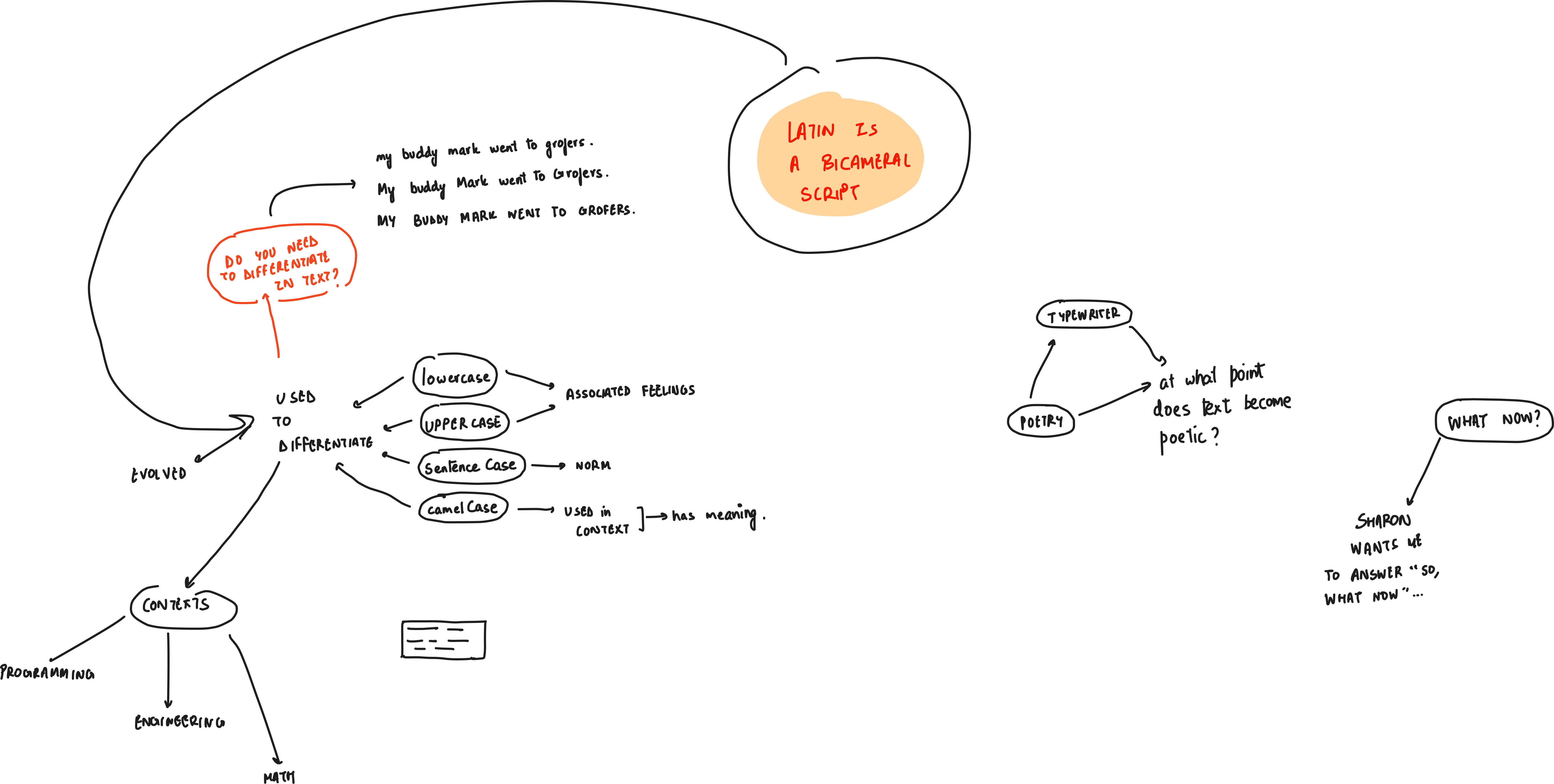 and, you asked me “so what” — as in how will understanding this help me? but it will — people in the world still write in sentence-cases (the reasons for which i will uncover in the essay (letterpress-remnant, need to distinguish, english being a bicameral language (or so it is thought), et-cetera.)). gah, i’m confused!