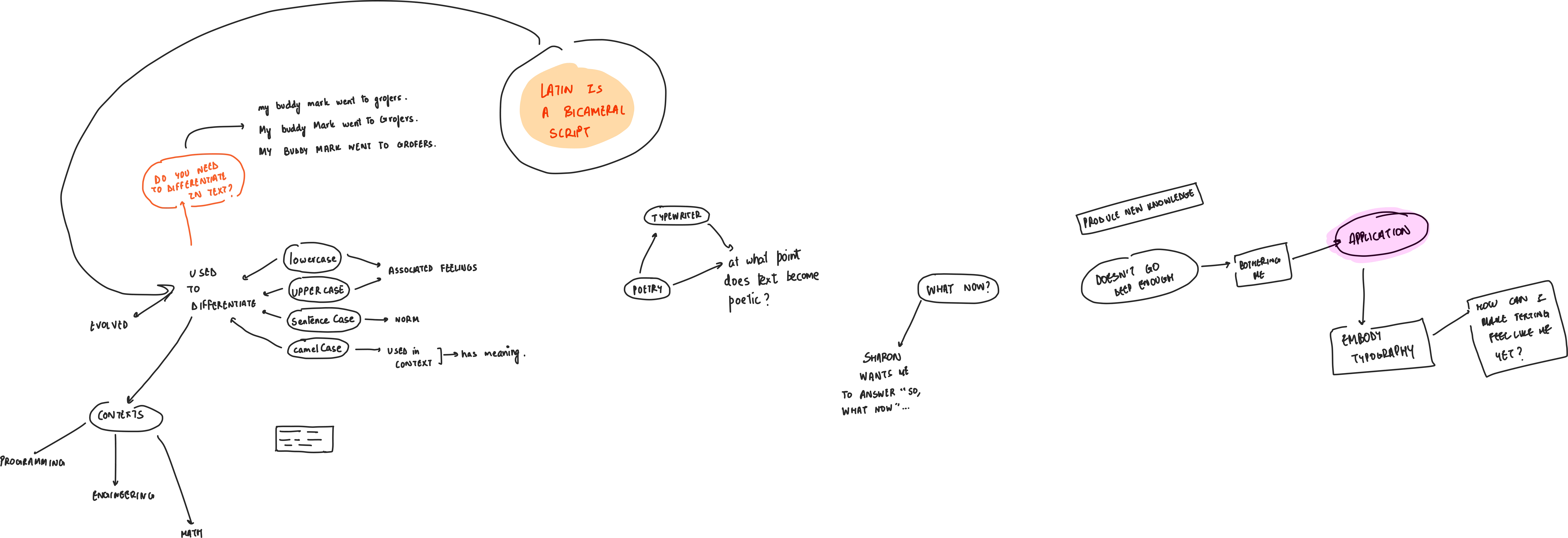 in our conversation, she chat-gpt-ed the references i gave her (bauhaus, bayer, et-cetera), and then said that it is already documented that lowercase letters feel different than uppercase (or sentence-case) texts (and, so, we already know this). i was hesitant — because (a) brands writing their names in lowercase to appear more friendly is very different from what bayer proposed with long-body text being more harmonious; relating to my personal context — how i am perceived differently when i write in lower-case letters, and so on. but, fine, we had limited time and i couldn’t argue.