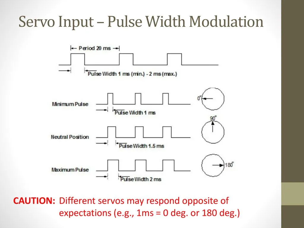 spoke about generating pulse-width-modulation to tell a servo angle to rotate to. servos expect a pulse every 20ms or so. just by changing the duty cycle, you can tell a servo what angle to rotate to.