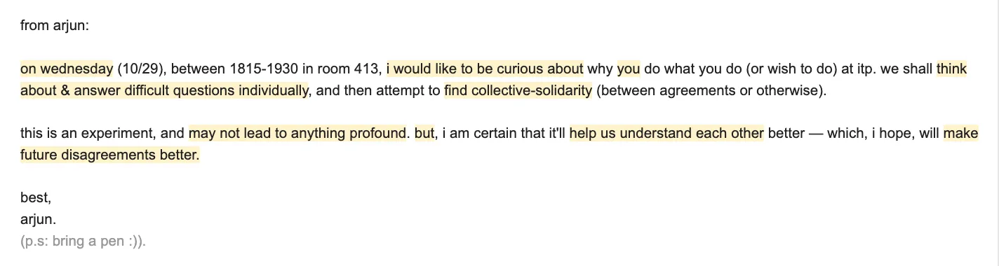 then, through probes, we collectively understood larger themes behind the kind of work that people want to do here at itp.