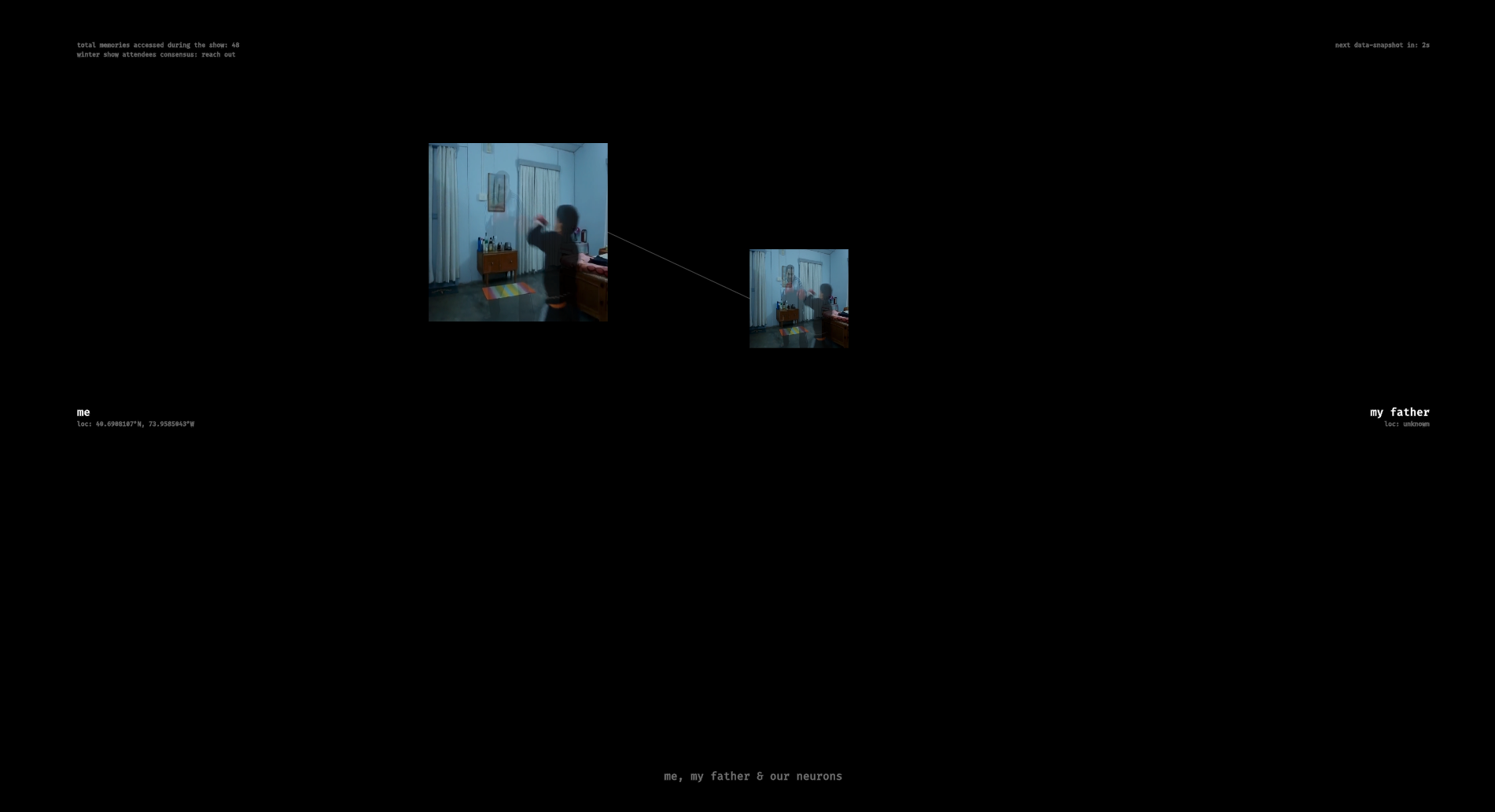 this project invites you to influence my dilemma. physical-units in space represent neurons in either my brain or my father’s. by moving them around, you see the same memory represented differently in our brains. moving neurons of the same memory to the center combine the two estranged memories. every 3 minutes, the program takes a snapshot of all the neurons and calculates a score that results in the collective decision of whether i should ‘reach out’ or ‘let go’.