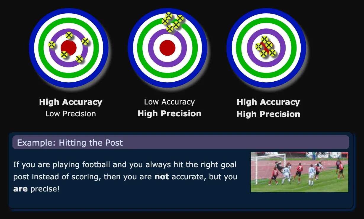 accuracy is how close a measured value is to the actual (true) value, while precision is how close the measured values are to each other.