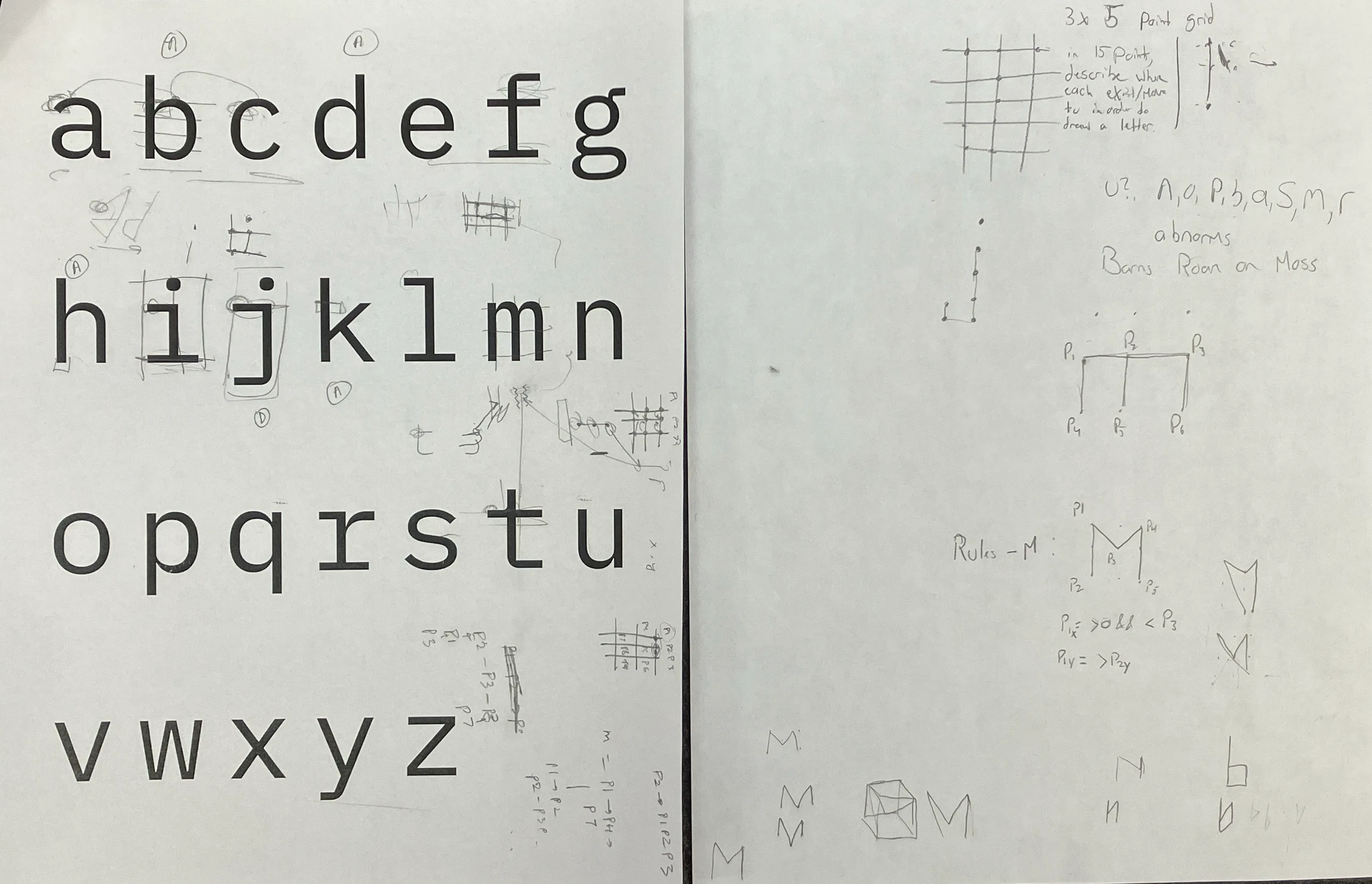 matt & i want to make spatially represented typography that evolves over time. computation is the only way to do it, simply because so many patterns exist. and, latin letters seem to be constructed with rules; but they're not usually thought of as that way.