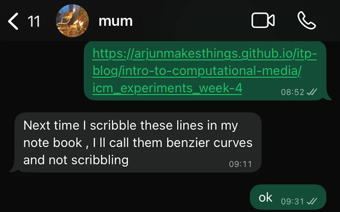 so, i wanted to take some time to understand the math behind bezier curves (and make a sketch around it). i think this approach worked well with me, and fits my approach to itp — learn a new thing that you want to, if you already know the thing that is meant to be explored that week.