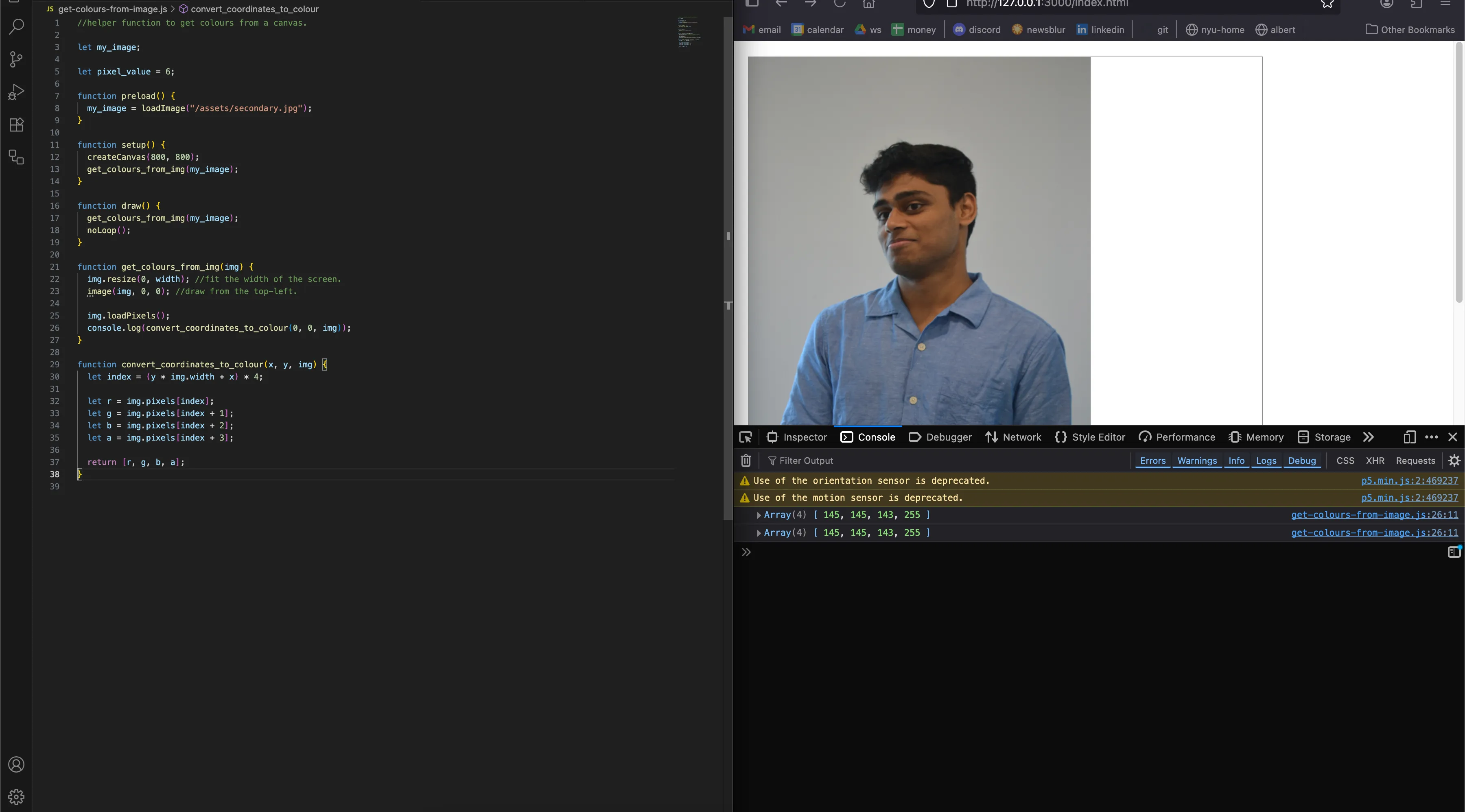img.pixels[4] //this would be the red value for the next pixel (1,0).img.loadPixels must be called once, and then the colours can be assigned (in my use-case). i wrote a couple of helper functions to load colors, and then convert colors for an x, y coordinate.