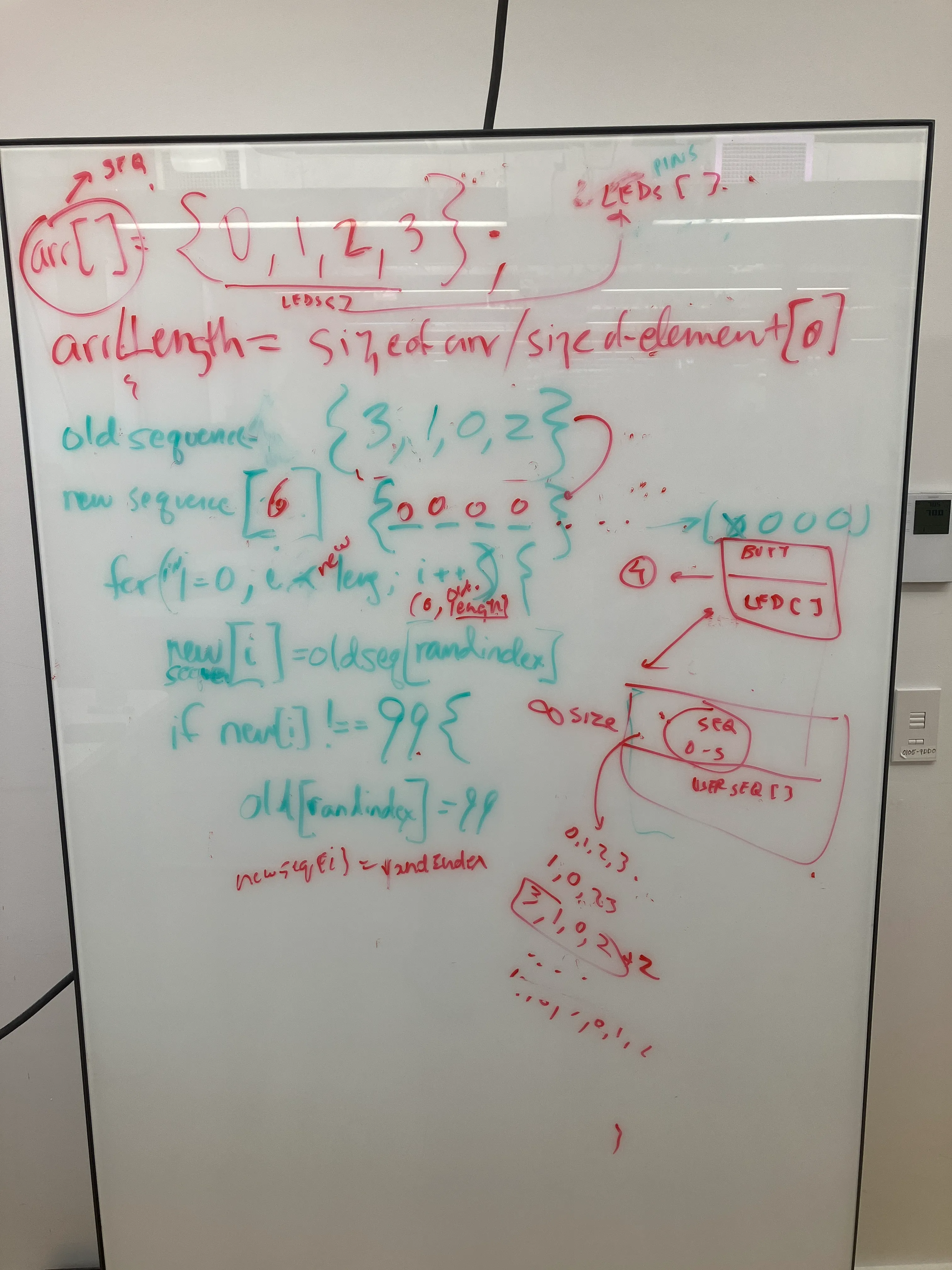 no, something's not right,. the programmatic flow is very simple: when it turns on for the first time, light up (and shut) all the leds one after the other (except red and green of course) with a delay of 500ms. then generate a sequence. play that sequence out. each led turns on for 300ms, and then turns off. when the sequence is completed, all leds should be off (because only one led, as part of the sequence, turns on during the moment in the sequence). then, wait for player input. when player has inputted the required number (length of sequence), evaluate whether it was right or wrong. if it was wrong, light the red led for 500ms. generate another seqeunce of the same length (say, 4 in this case). if it was right, light the green led for the same duration. then turn it off, and generate a new sequence of n+2 items (say 6 leds). then play them out. repeat.
