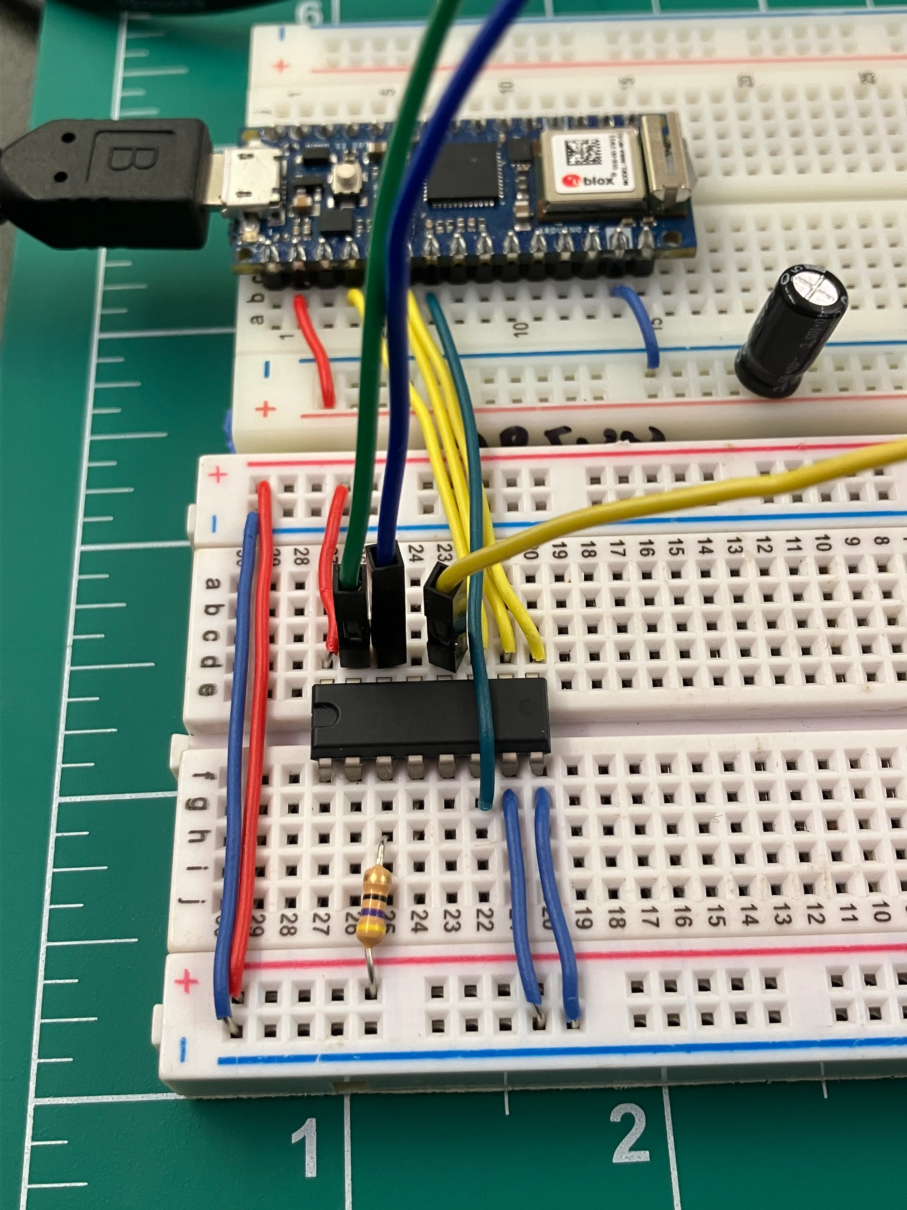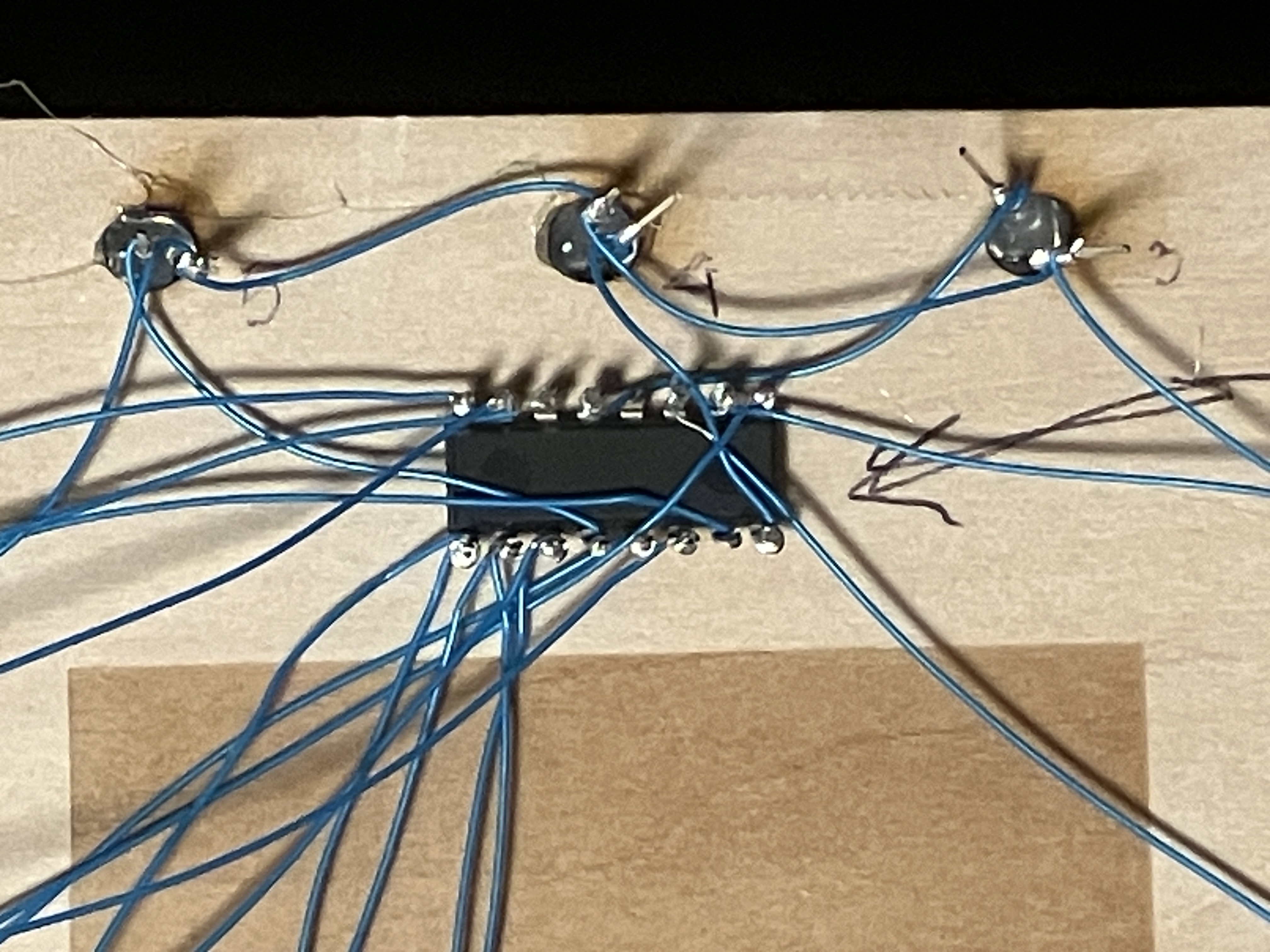 then, with octavio, we figured out how to make it work (because my circuit didn’t work — i thought the inhibit-pin could do with no signal, but it needed a low-signal).