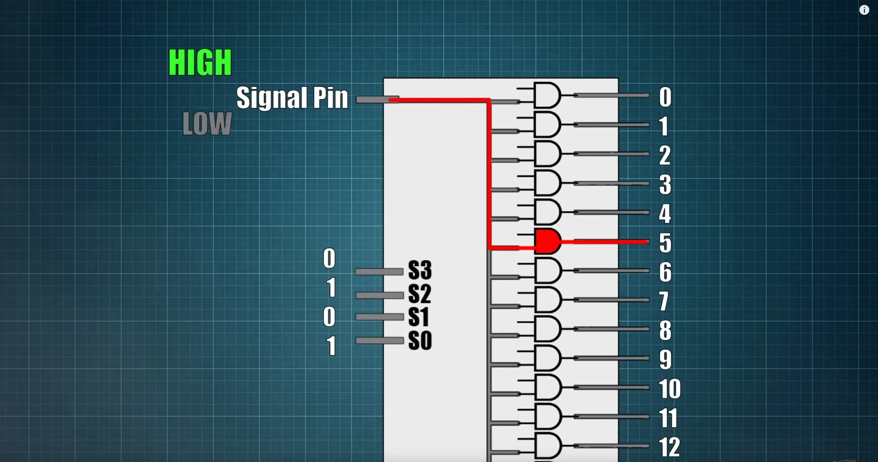 looked at something called a mux or multiplexor. think of it like a motor-driver, but uses 4 pins to give out 16 outputs (based on varying combinations of highs & lows).
