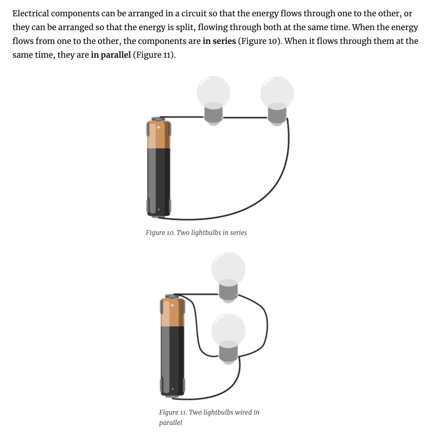 in the first case, which is series-based circuits, i assume that voltage is lost as it reaches the second bulb. so, eventually, the last component in a long series will receive less voltage.