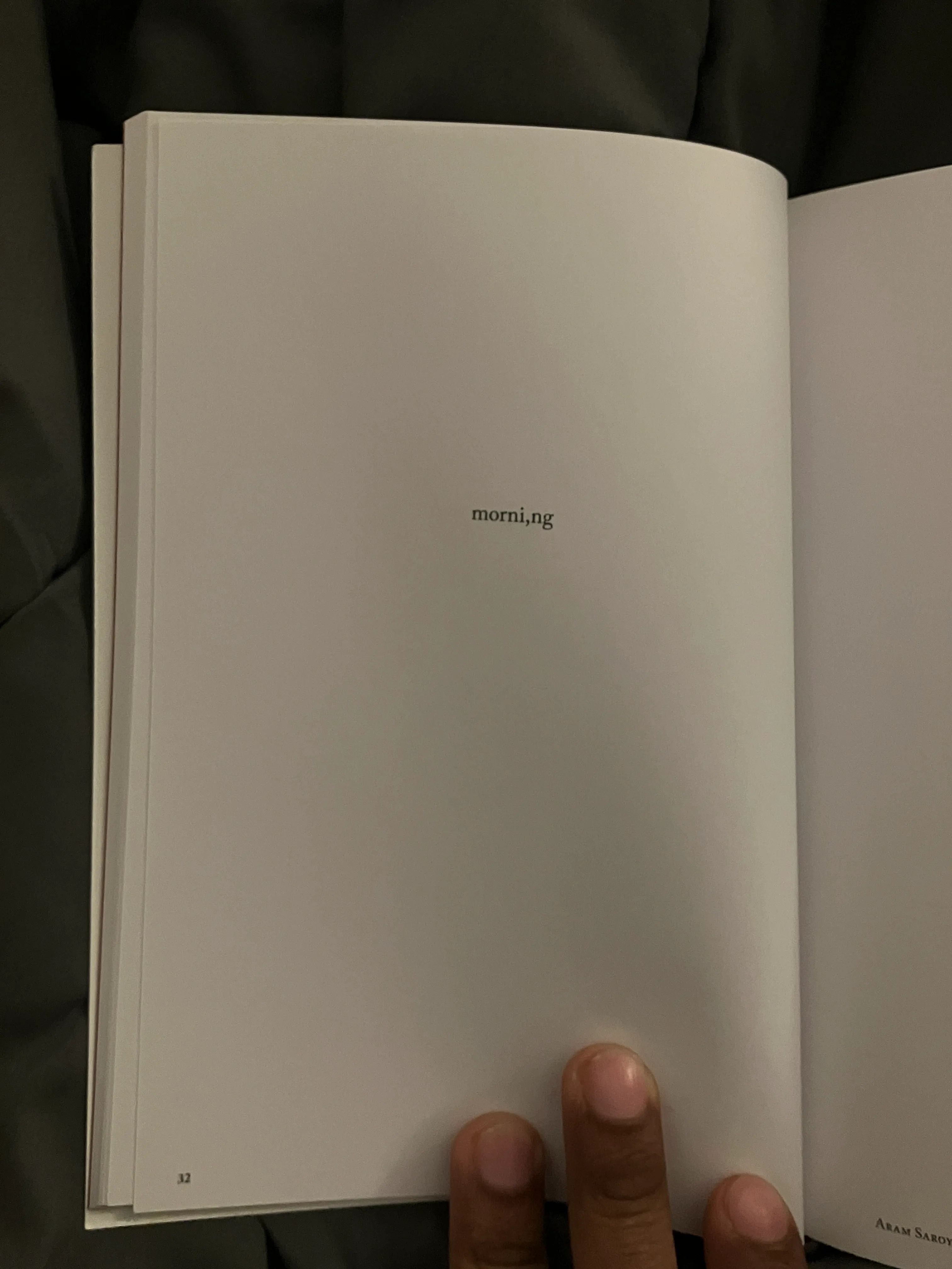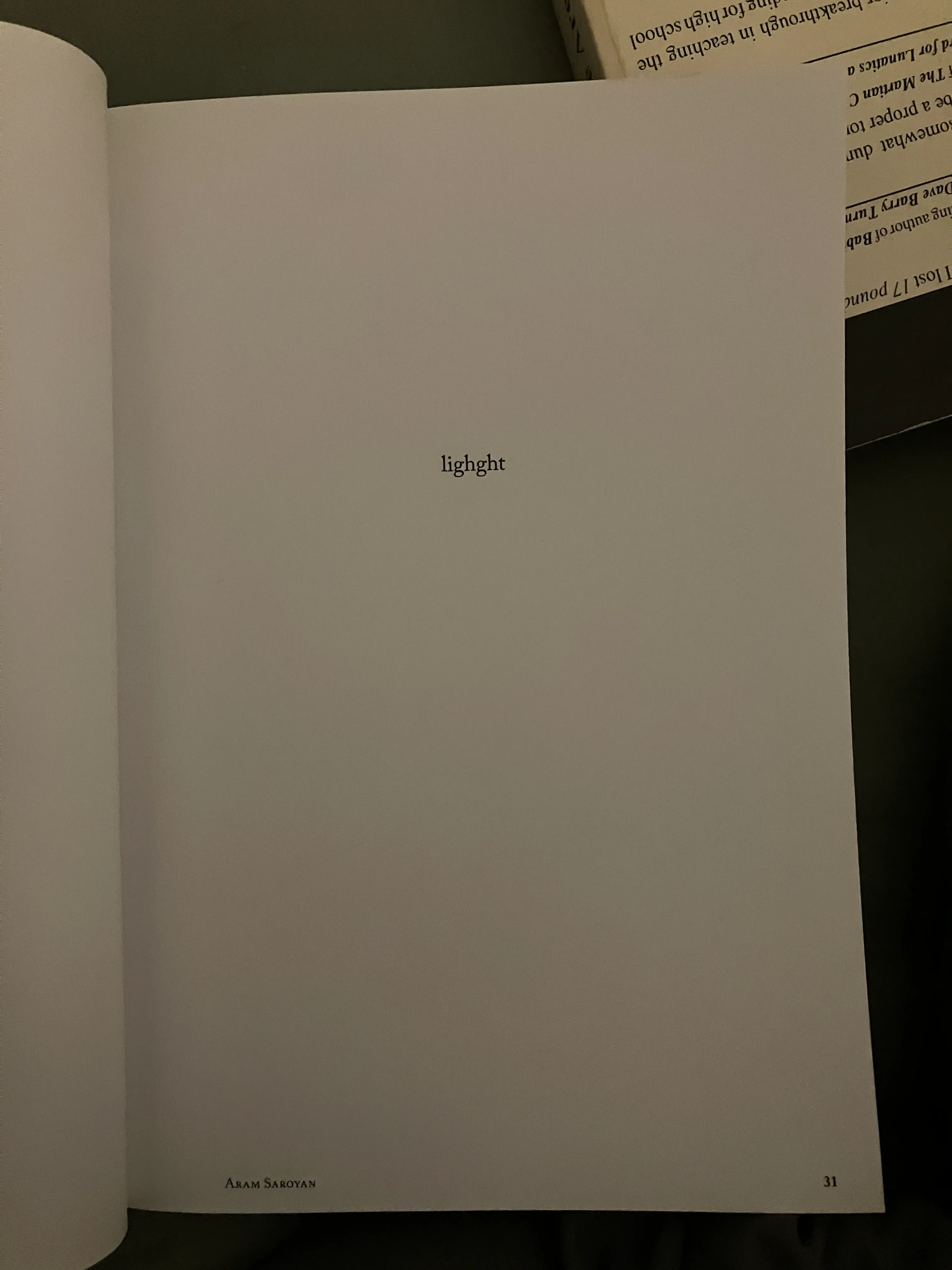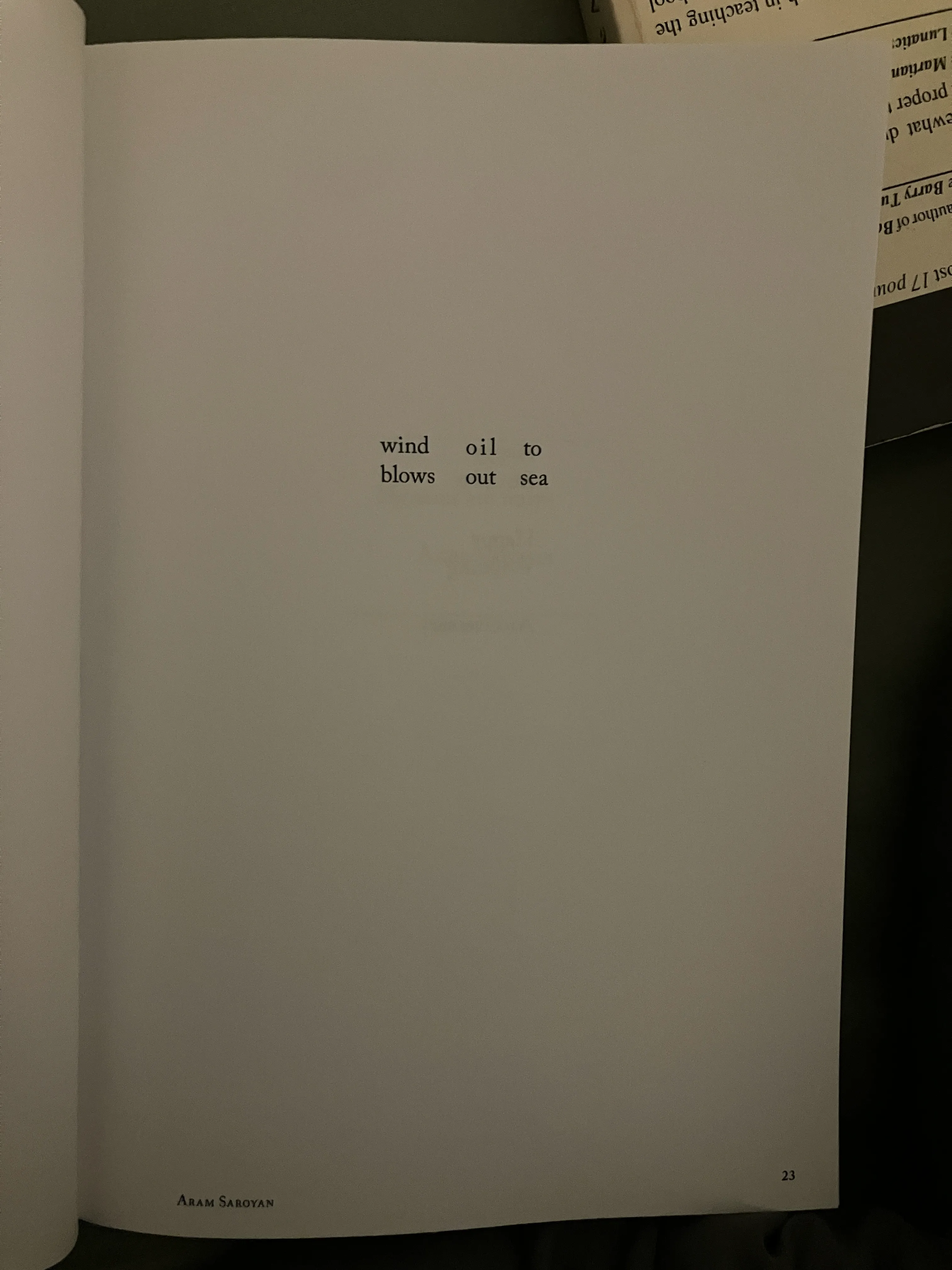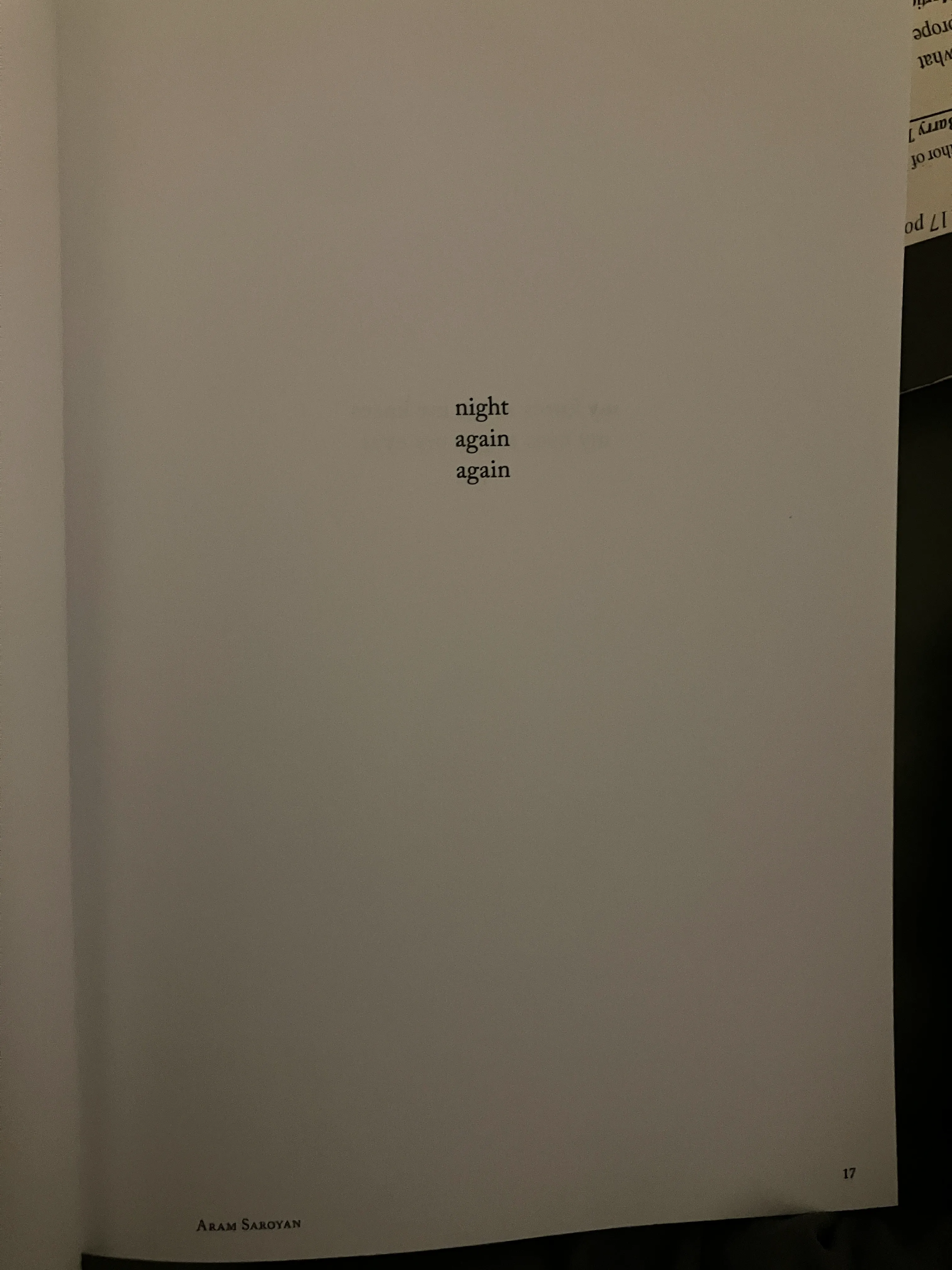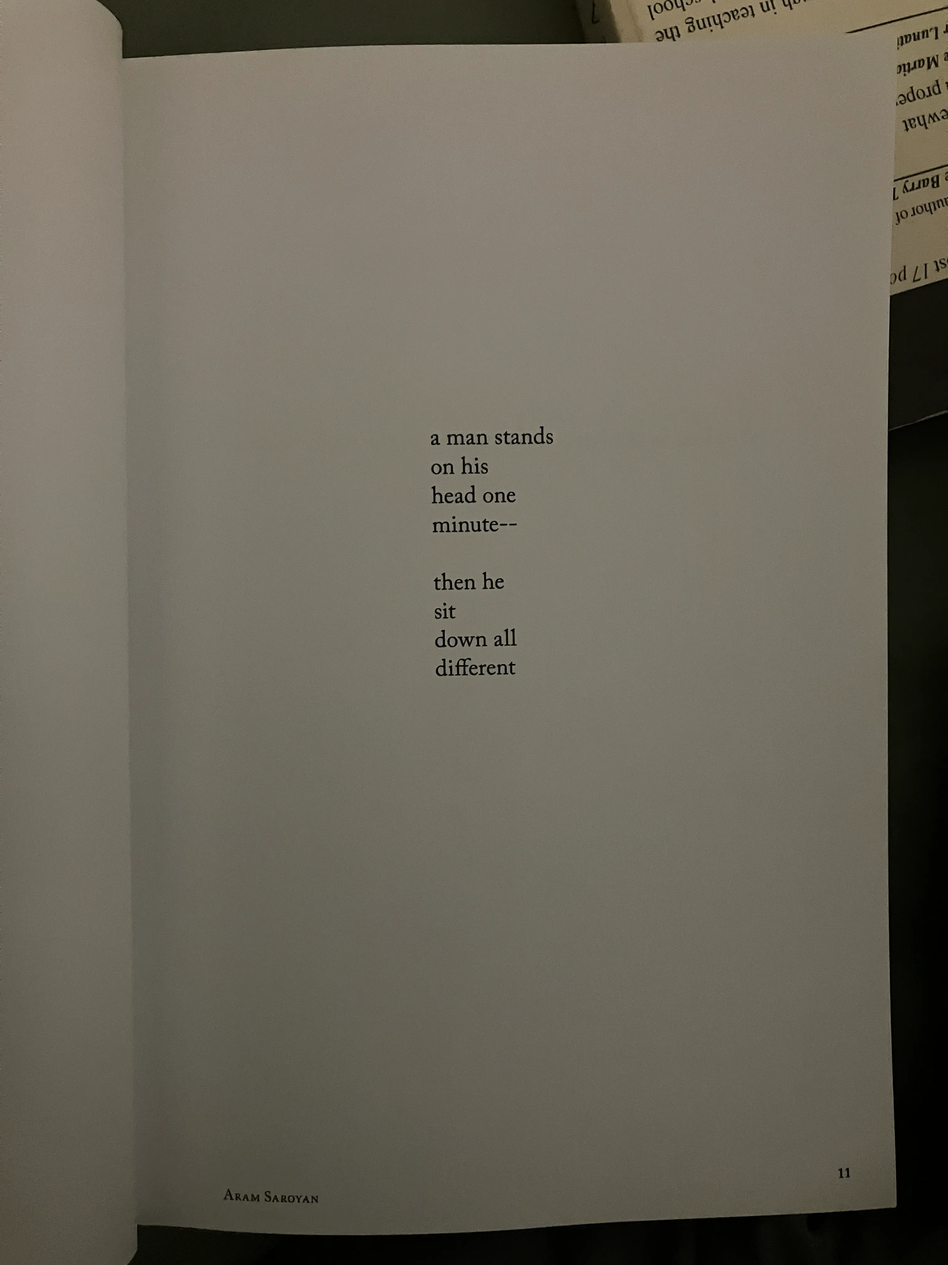 allison parrish let me borrow her copy of complete minimal poems, by aram saroyan; during my conversation with her (conversation with allison).