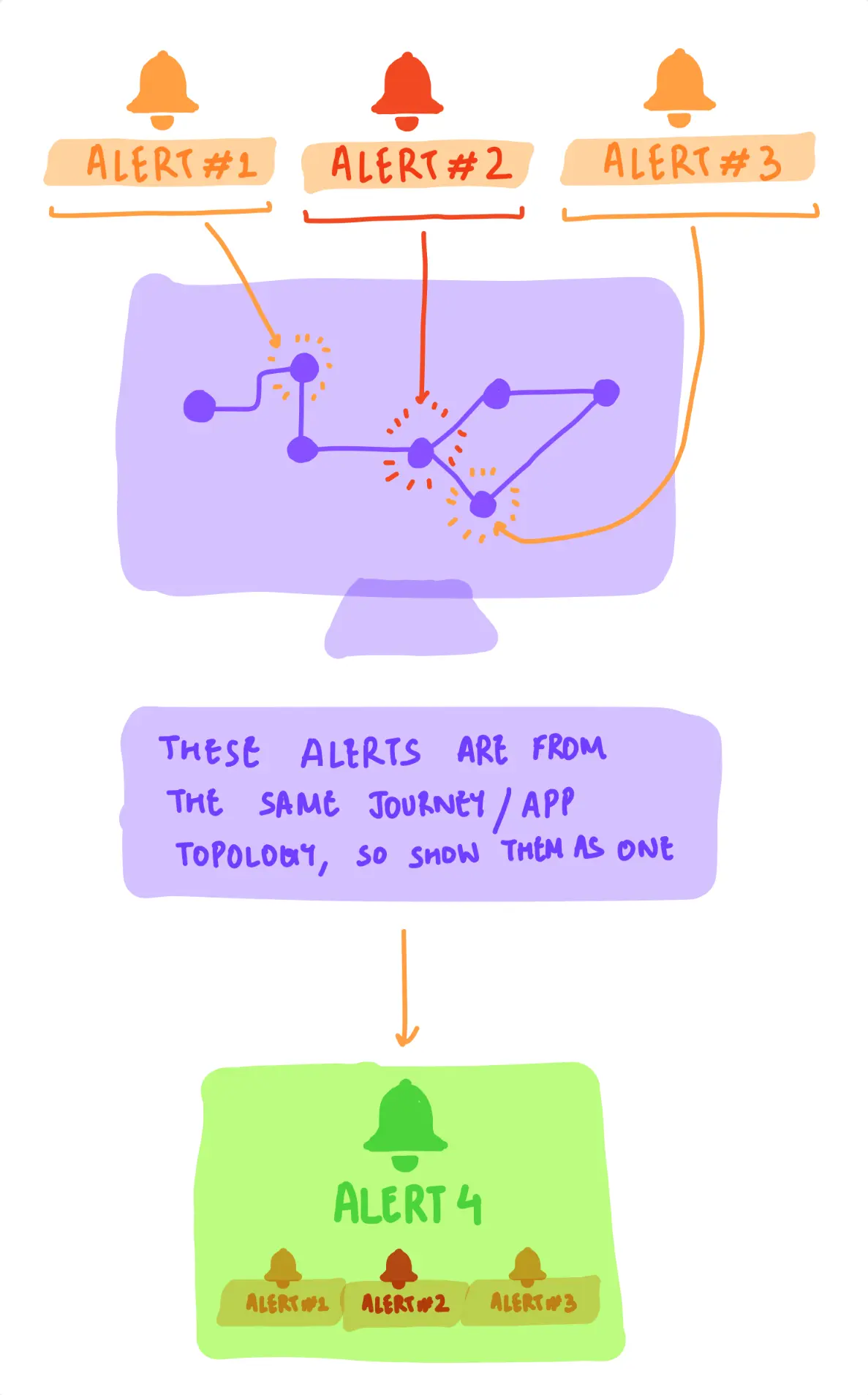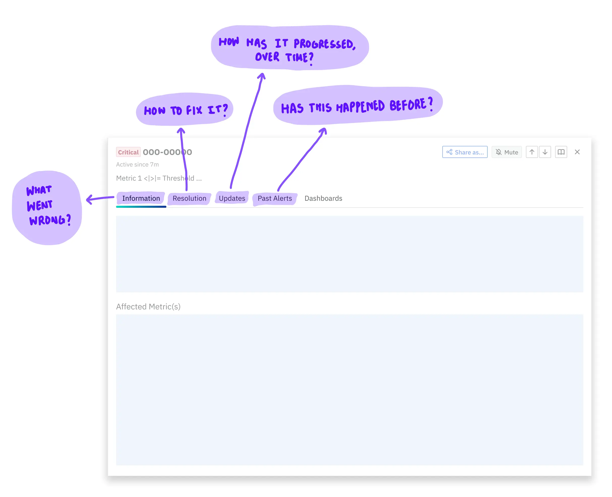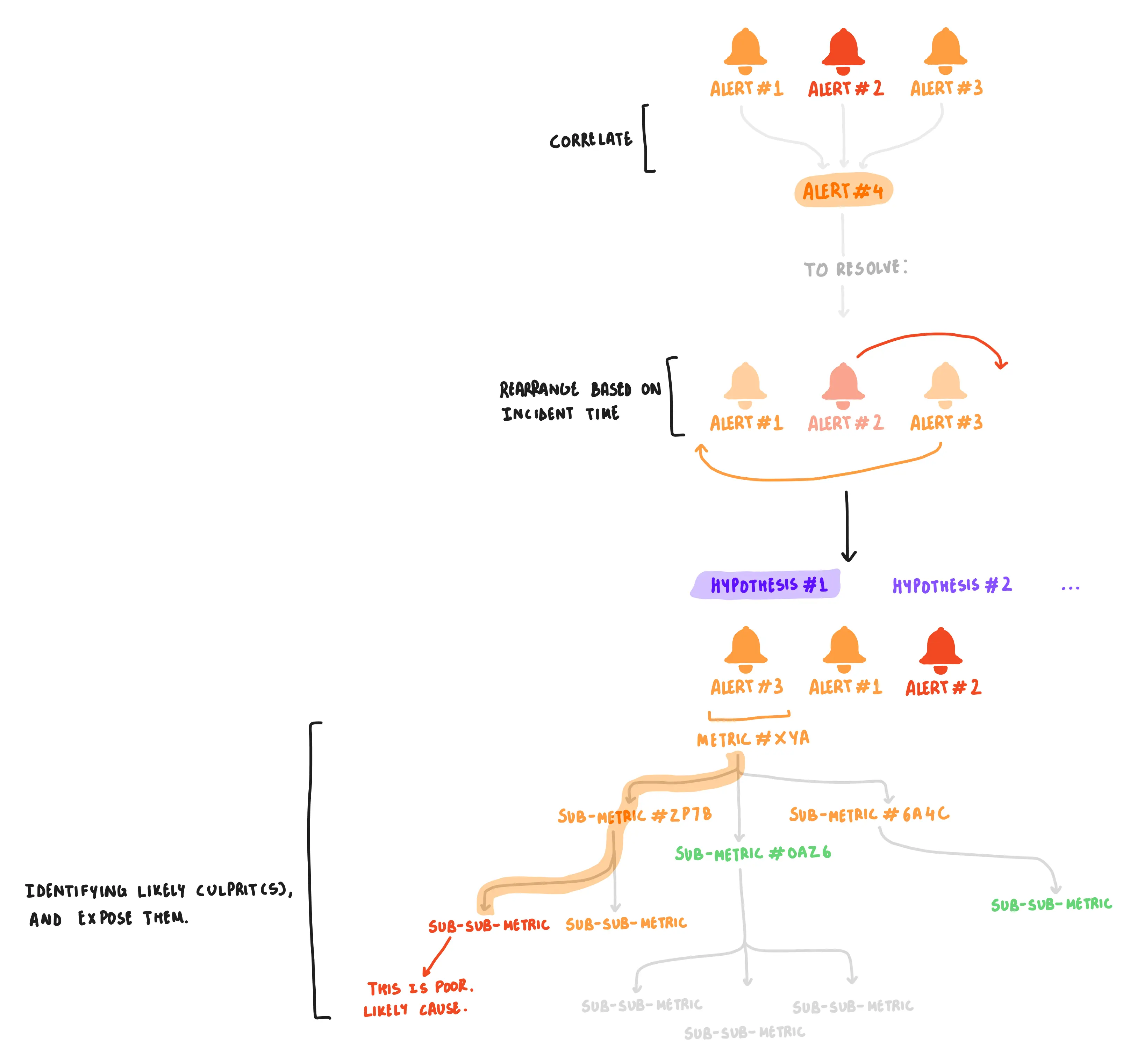 people from these teams were having to deal with multiple alerts in a single minute, manually assessing impact, and jumping through windows (or tabs) to form root-cause-hypotheses. previous design-work had been put in to improve these workflows, but failed to provide a comprehensive solution that was, both, sellable & usable.