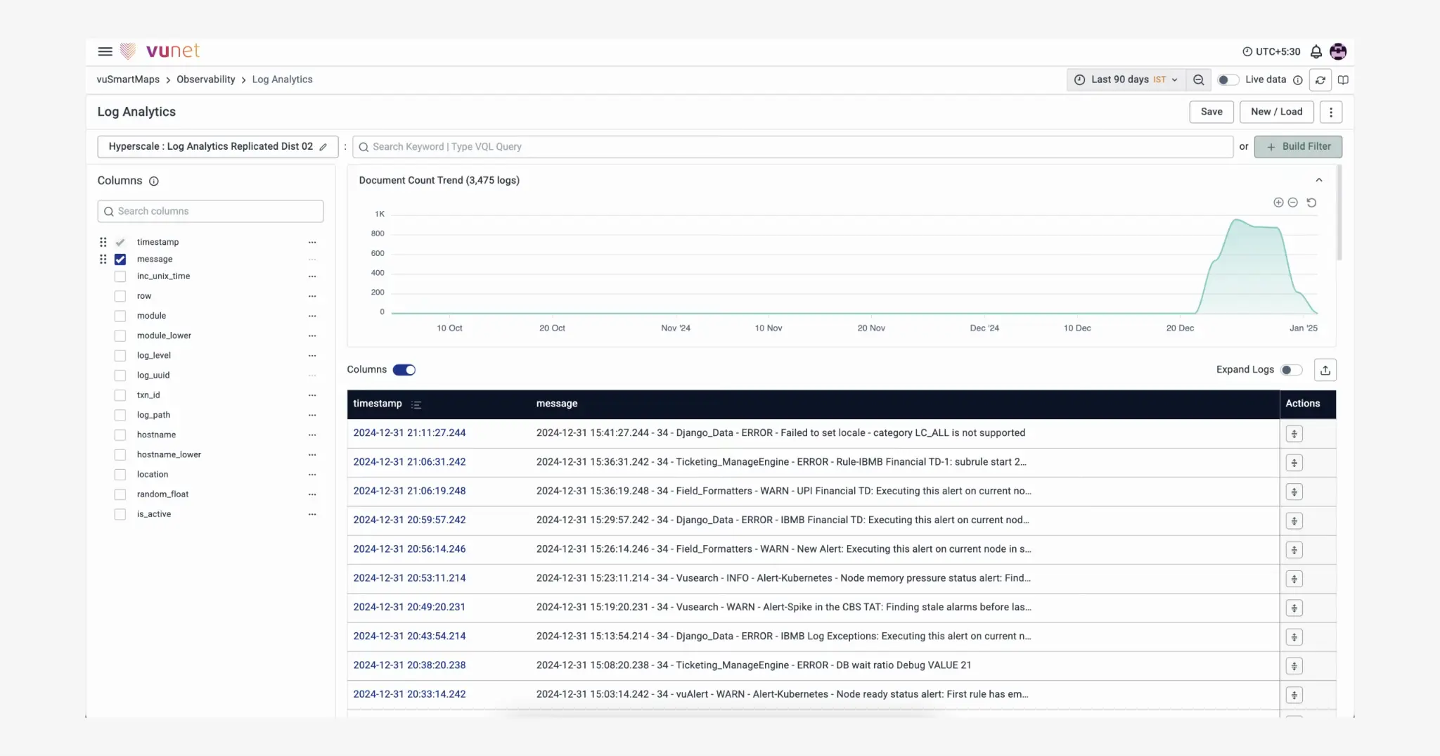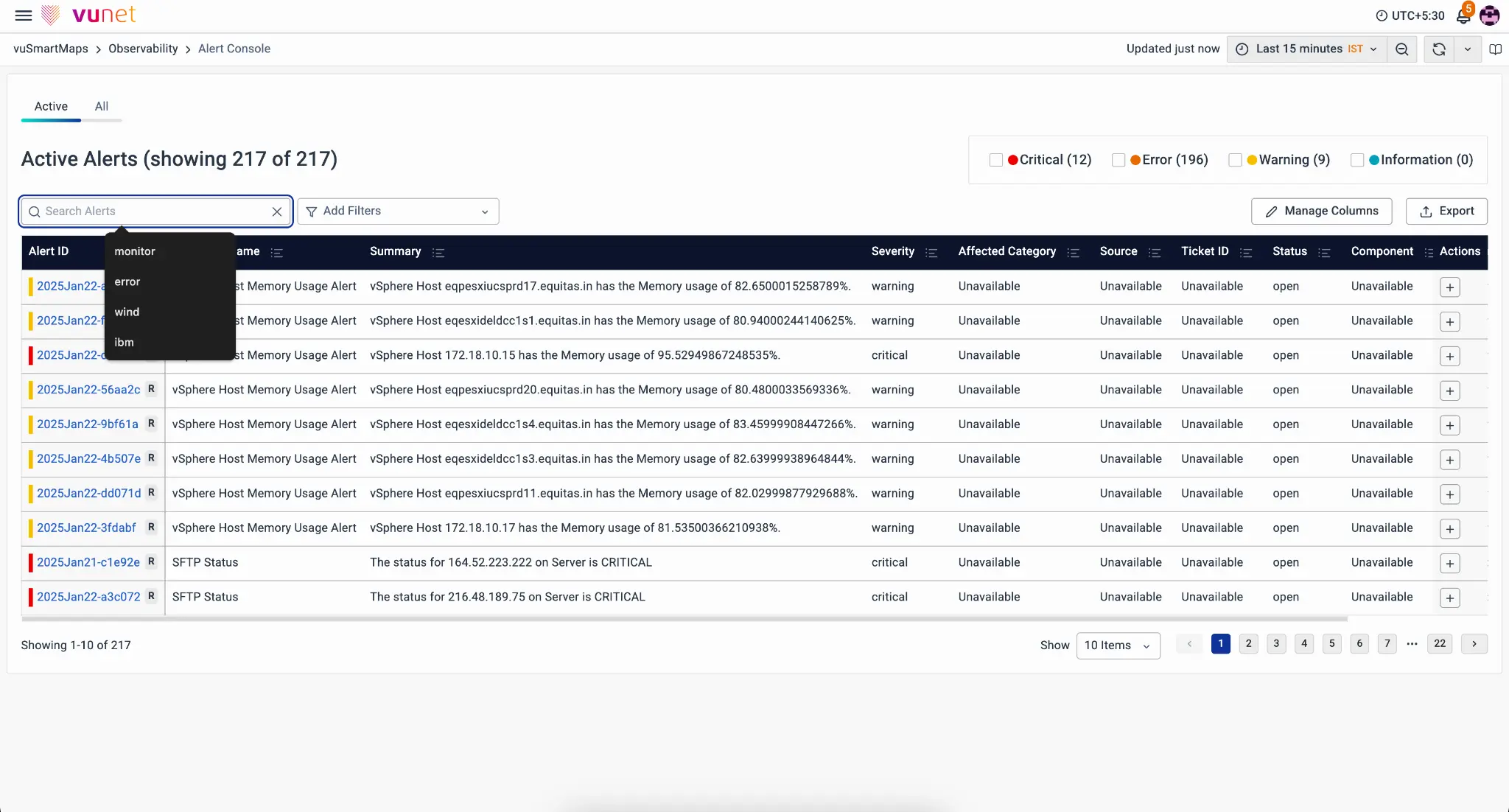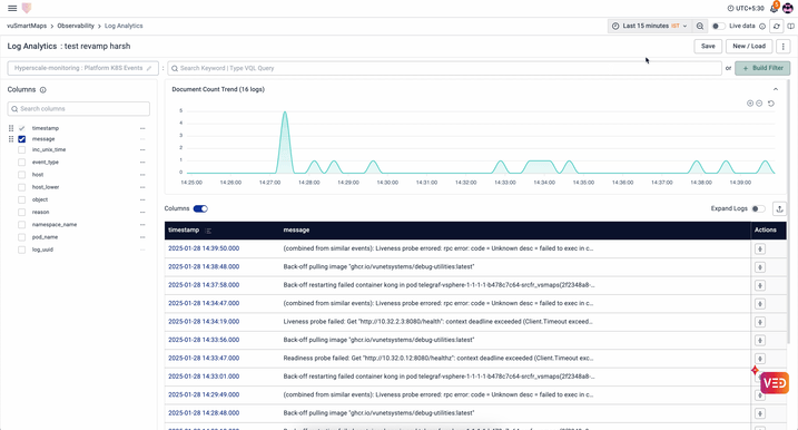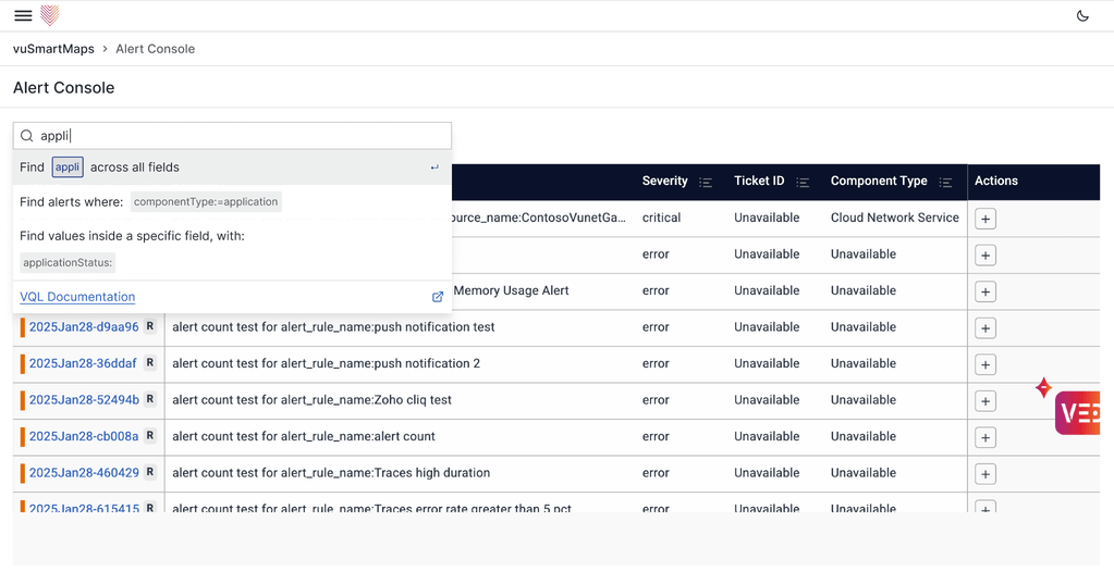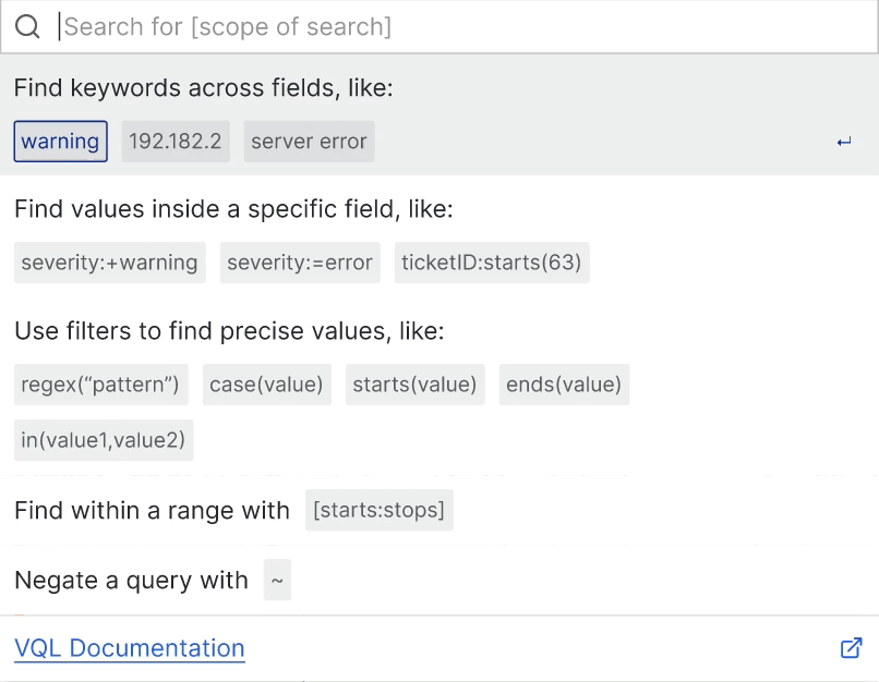 to facilitate more complex searches on pages with tables, vunet had built its own query-language (vql). this allowed people to write functions & expressions to find specific items across loads of entries. however, using vql assumed an understanding of the language & its syntax, which only 'advanced-users' were expected to have. therefore, the ability to write vql queries was limited to specific pages.